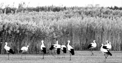 秋季迁徙时,在辽河口双台河口湿地停歇的东方白鹳。