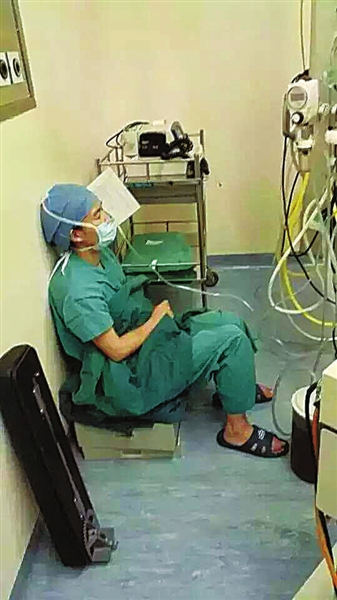 “累得口罩都没有摘下,工作服也被汗水浸透了。”今年4月,河南一组医生手术后倒在地板上睡着的图片热传网络,感动了无数网友;7月,长沙一张医生在衣柜里打盹的照片同样在网络上火了起来,被网友点赞称为“最美睡姿”。这两天,微信朋友圈又迅速被宁波一位医生的照片刷了屏。照片中,刚做完8台手术,还穿着手术服的丁慧青医生靠着墙缩坐在地上,正吸着氧,满面倦容,模样令人心疼(见左图)。
