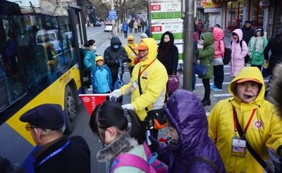 京城万名文明引导员为疏导城市交通忙碌着,在自新路公交站胡守义、高玉英、刘茹英早晚交通高峰时疏导乘客已经坚持10个年头。