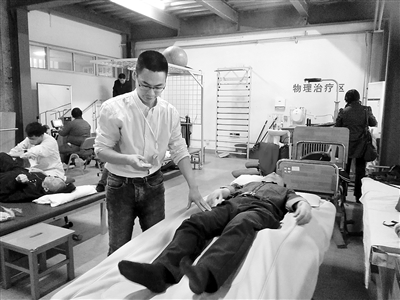 王海鹏在帮患者进行康复训练。 王海鹏供图