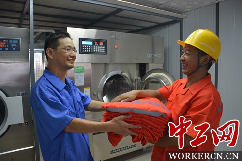 该公司工人一般都是在地下工作,衣服上经常沾满了泥土,下班后已是精疲力尽,根本没有精力去洗衣服。为了解决农民工朋友的后顾之忧,该公司北京地铁8号线三期项目爱心服务支队和项目领导班子调查讨论,不惜花10万元巨资于今年7月份购买了一套全自动洗脱机和烘干机,并在工地生活区空间紧张的情况下,想方设法建立了洗衣间和晾衣间,安排专职人员免费为工人清洗衣服和消毒,极大的便利了工人的生活。