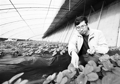 马红军在草莓大棚查看草莓生长情况(12月6日拍摄)。