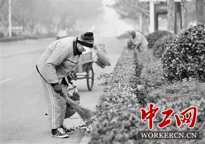 1月1日,山西运城市环卫工人清理绿化带内垃圾。