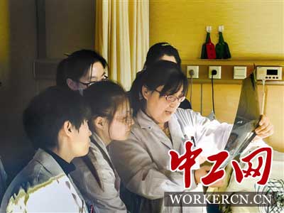 病房内,张玉梅带领年轻医生查看病人病情并进行现场教学。中工网记者 王维砚 摄
