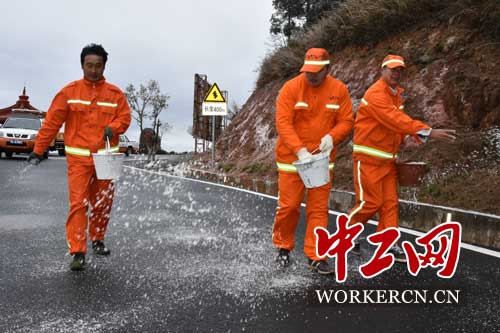 德化公路分局的养路工人在公路上撒盐除雪破冰保畅通。