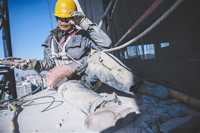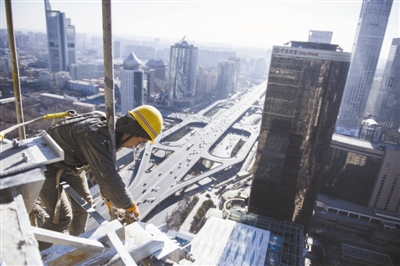 →1月5日,27岁的黄兵正在国贸三期B座的脚手架上工作。CBD是北京最具现代化的一张名片,它的建成离不开全国各地农民工的参与。