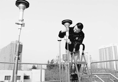 陕西西安环境监测站工作人员王照擦拭采样管上的采样头。姜峰摄