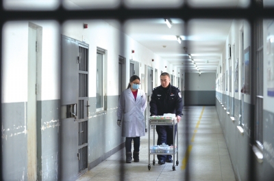 马振兵的办公室里有一个小黑板,上面记录着每天的工作提示。“一定要盯紧某某人吃药”,小黑板上写着几行应该注意的事项。马振兵说,医疗民警的第一项职责便是根据嫌疑人体检报告,向办案机关提出是否收押的建议,“有的嫌犯虽然患有疾病,但仍需收押”。职责之二就是重点监控这些人的病情,并及时发现其他健康在押人员的突发疾病。“另外,驻所医生是全科医生,一些在押人员的危重疾病及一些像CT、核磁共振等检查项目则需要外出就医。”马振兵说,医疗民警的第三项职责是联系医院、护送病重人员外出就医,并根据医生的诊断报告,做出是否改变强制措施的决定。