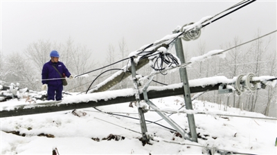 被积雪压倒的树木压断了不少线路,必须砍掉才能恢复供电。在明礼乡,供电所员工王军、冯体冬拴上保险绳,小心翼翼下到山崖下砍树,凌冽的寒风吹到脸上,他们却感受不到寒冷,“只是手有点木了,不听使唤”。
