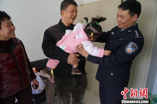 临别之时,嘟嘟从舅姥爷周强怀中挣扎出来,要民警“爸爸”岳浩鹏抱她。韩章云 摄