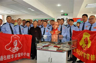 雷锋战友乔安山来社区与雷锋车队队员合影