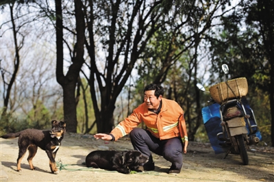 3月28日,韩明道和陪伴他的两只狗嬉戏。