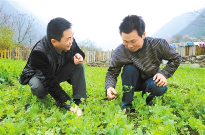 图为3月27日,广东援藏干部、察隅县农牧局副局长莫伟冬(左)在胡小兵的菜园里进行技术指导。