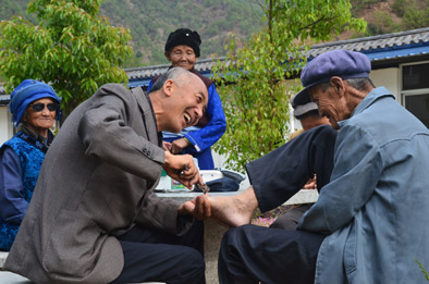 ▲2015年4月25日,李桂科在山石屏给康复者老人们剪指甲。摄影:苏鹰
