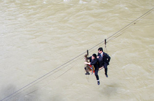 ▲4月21日,重庆奉节县第三人民法庭的书记员王威(拉绳者)抱着国徽和审判员舒涛乘坐溜索去往九盘河对岸的兴隆镇回龙村进行法制宣传和走访。