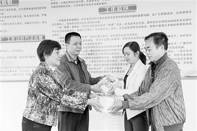 陆川县法院院长詹一林(左二)向陆河村村委会捐赠法制宣传书籍,全国人大代表梁丽娜(右二)参加捐赠仪式。覃 坤 摄