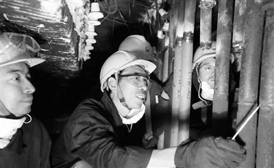 谷刚(中)在乙烯裂解炉检修现场向青工传授技艺。