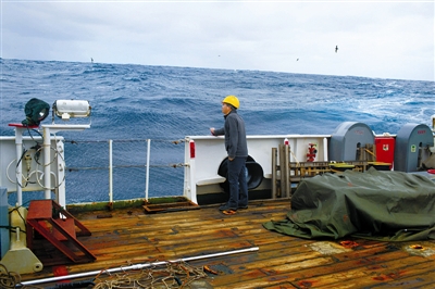 5月1日下午,周建平在后甲板上观察海况,希望明日天气能够按预报的那样转好,可以回收地震仪。