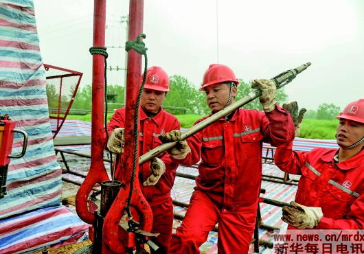 4月26日,在中石化江苏油田一处井下作业现场,田明(中)在调试自主设计的摩擦式压力计投捞装置,准备用来进行井下测压测温作业。