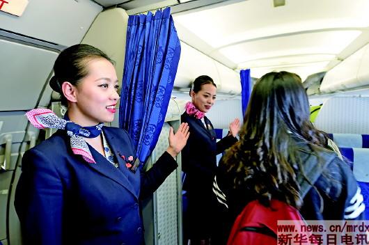 今年28岁的双胞胎乘务员,她们有着一个平凡却不简单的青春梦想,那就是让每一位她们服务的乘客“开开心心上飞机,平平安安下飞机”。(新华社记者范培珅摄)