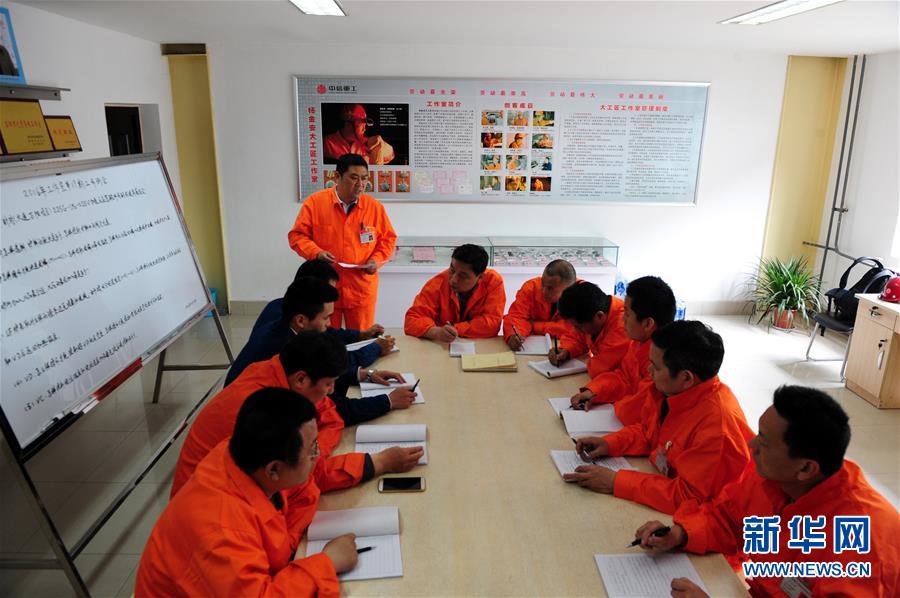 4月28日,杨金安(后方站立者)和“创客”团队成员们在中信重工的会议室里讨论技术难点,为当天晚上即将开始生产的一个大订单做准备。今年49岁的杨金安是河南省洛阳市中信重工冶炼车间50T电炉班班长。1984年高中毕业后,他进入中信重工从事炉前冶炼,目前是中信重工首批五名“大工匠”之一,带领着一个12人的“创客”团队。冶炼车间如同战场,炉内高温达1600℃,车间温度达50℃,工人上班必须身着加厚的阻燃服。车间设备运转轰鸣声不断,工友们站在身旁也要扯着嗓子讲话、挥动双手比划。设备运转1分钟需要耗电400度,为了降低运营成本,炼钢都在晚上进行。如果遇到重大的订单,杨金安经常几个昼夜不眠不休。责任大,风险高,但他一干就是32年。虽然工作忙,但杨金安坚持记炼钢笔记,每一炉钢水的电耗、氧耗、钢水回收率等,他都认真记录在工作手册上,回去再分析总结。他写下的50本工作手册,成了年轻的炼钢工人传阅学习的“宝典”。 “炼钢如打仗,单枪匹马势必敌不过千军万马,团队协作尤为重要。”杨金安经常和团队成员一起探讨生产过程中的难题,固化每一个特钢项目的冶炼方法,鼓励徒弟们成为“战无不胜的钢铁战士”。各种荣誉纷至沓来后,杨金安并没有停下科技攻关的脚步,“特别是当以我名字命名的大工匠工作室成立后,我以更大的热情和毅力投入到了这红火的事业当中。” 新华社记者 冯大鹏摄