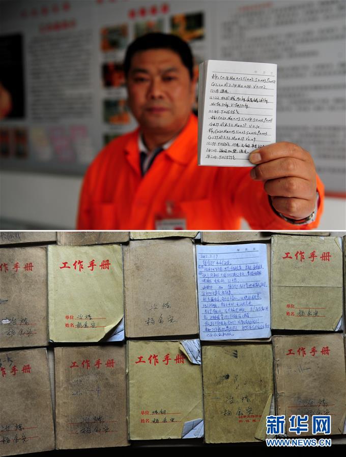 杨金安展示自己的笔记本(拼版照片,摄于4月28日)。这些记满了各种参数的笔记本是杨金安多年工作经验的结晶,也是年轻炼钢工人传阅学习的“宝典”。新华社记者冯大鹏摄