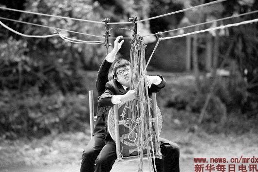 走出李高强的家门,又来到了九盘河的铁索边。李明航将巨大的国徽小心地捧在胸前,王威则将沉重的背包抱在怀里,他们坐上了铁索,向对岸缓缓地滑去,也向下一个目的地滑去。