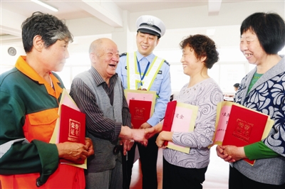 5月11日,受表彰的四名好人与被救助的老人(左二)在一起高兴地交谈。