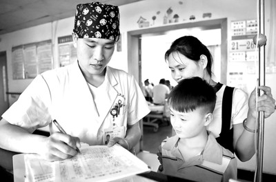 时磊一身白大褂,头上一顶深蓝色大嘴猴印花护士帽,使这个1.75米个头的90后大男孩看上去阳光俏皮。时磊说,很多孩子看到传统的白色护士帽总容易吓哭,这种护士帽不仅看上去温馨融洽,还拉近了与小患者的距离。小朋友孔瑞阳看到时磊,脸上迅速露出灿烂的笑容:“他扎针不疼,有时候还逗我笑。 ”