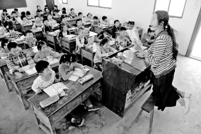 李元芳跪在板凳上讲课。特约摄影 陈彬