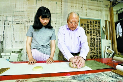 手握鹅卵石,在一副手卷背面,均匀涂抹过一层川蜡后,徐建华向徒弟演示如何用石头打磨压制纸面。