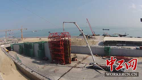 “整个墙身45方,花了20多个小时浇筑,这么多人,这么多设备,顶着这么大的太阳在‘熬’,在其它工地从未有过这种情况,这真的是用‘心’在浇筑!”在中交港珠澳大桥东人工岛敞开段中墙最后一段墙身清水混凝土的浇筑现场,岛隧项目总经理林鸣不禁为东岛建设者竖起了大拇指。