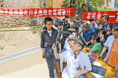 该院白求恩医疗队开展“重走白求恩路·老区健康行”活动,为老区村民义诊。刘会宾摄