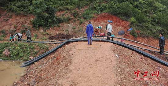图为7月1日陈俊(右一)和工友们在余家冲水库安装虹吸排洪管道 刘佰华 摄