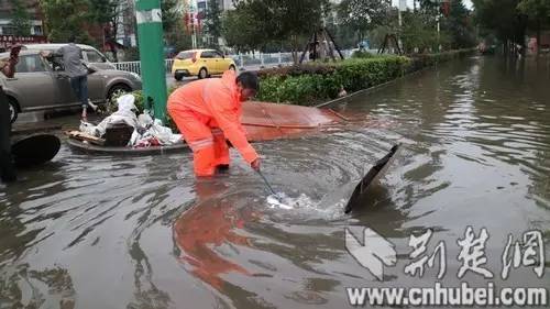 监利县城区排水疏捞工暴雨中昼夜值守, 他们趟着齐膝盖深的渍水,守卫在路边的窨井边,保持窨井正常排水。