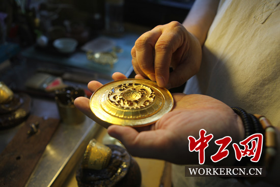 不管从什么角度看,他制作的观音的眼睛都能对着你笑;一千多年前的辽代金质文物在他的手中也能“整旧如旧”;《八仙神葫》、《静安寺法僧三宝印》……他的一件件作品让人流连忘返。他就是上海老凤祥有限公司金银摆件大件组生产组长沈国兴。