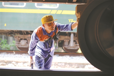 调车员在高温下为即将出发的车体做安全检查。 尤嘉乐 万程鹏摄。