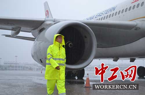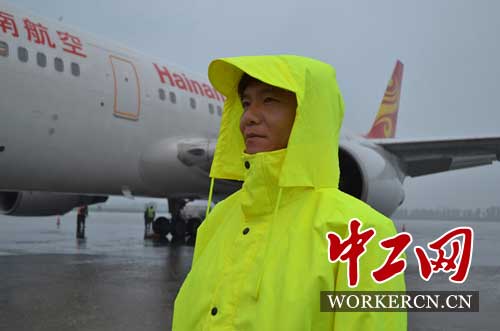飞机监护员雨中工作照