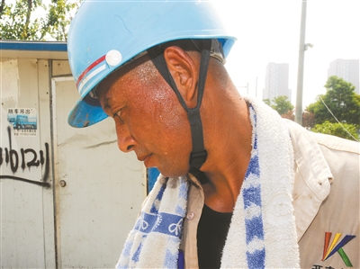 下午3时,记者来到施工现场,小区外已经挖出了一个长80米、深1米、宽60厘米的大沟,工人们正忙着铺管道。“我们早上7点就来干了,越干越热,太阳直头晒。”马驰开玩笑说,他们早已在汗水里洗过几遍澡,浑身都晒得通红发烫。为了凉快些,不少工人干脆脱掉上衣。汗水顺着脊背哗哗直流,混杂着泥灰,就像在身上抹了一层泥浆。还有的工人穿着衣服干活,风一吹,白花花的汗碱渍在衣服上,形成了一片片白斑。