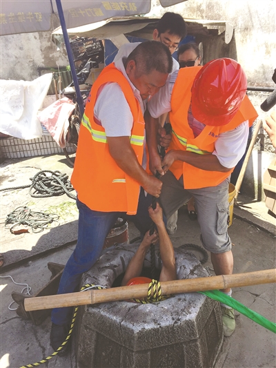 同一时间,在苏州姑苏区平江街道建新巷50号大院内的一口井边,护井工人张迪培扎着马步,身子微微后仰,两手交替向外拉一根伸向井里的绳子,绳子的另一端系着他的工友,一旦手里打滑,狭窄的井道很有可能会擦伤工友甚至发生不可测的意外。因为用力过度,老张的额头和手臂青筋凸起,身上的汗一滴滴往下淌,脚下水泥地被打湿了一片。直到工友整个身子都爬出井口,老张才松了一口气,拿起挂在脖子上的毛巾擦汗。