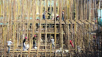 建筑工人们顶着烈日,为城市建设添砖加瓦。