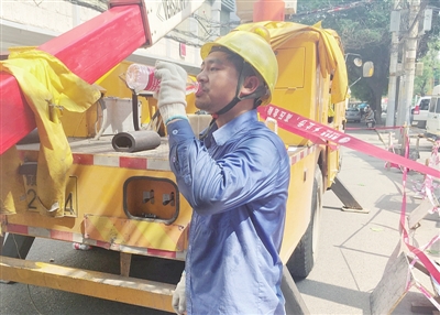 带电作业必须身着密不透风、橡胶质地的绝缘服。为了体验一下身着“皮衣”的感受,记者主动请缨要求试穿。结果不难想象,不出五分钟,就已大汗淋漓、呼吸不畅。