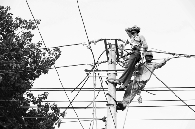 曾凡云和王小兵两位师傅背负着超过5公斤的工具在离地15米的电杆上作业一个多小时了。他们后背整个都湿透了,燥热的天气会让人喘不上气,不时会有眩晕的感觉。但他们身处高处,胳膊和双手一直没闲着,将新架设的导线一点点的敷设到电杆上。