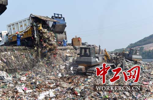 当多数人在空调房里躲避高温享受生活的时候,杭州天子岭垃圾填埋场的工人们依然在烈日下像往常一样工作着。一辆辆垃圾车不停地往这里运送垃圾,填埋工人们把这些垃圾无害化处理,填埋、整理、压实……