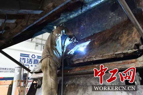 当靠近打开的清洁直运车辆大箱尾部时,一股强烈的热浪伴随着垃圾的气味扑面而来,只见身穿厚实电焊服的胡勇军保持着弯腰曲背的状态,跨站在温度高达六、七十摄氏度的半密闭大箱内,全神贯注地进行推板电焊作业。没一会儿他脸上的汗水直淌,工作服干了又湿,湿了又干,凝结了一层白白的盐。