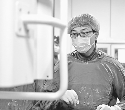 在介入室里,紧贴手术台摆放着一台高辐射的大型X光造影机。在手术过程中,它延伸了人眼的功能,使医生将患者的病变部位看得一清二楚,但医生要全程暴露在X射线的照射范围内。“在X射线照射下连续工作四五个小时,相当于连续拍2000多张X光片。”为了隔离电离辐射,医务人员不得不穿上铅衣。一场手术下来,经常会累得手都抬不起来。