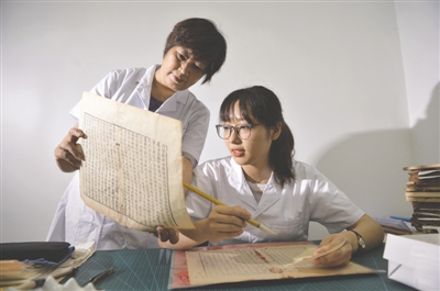 纸质文物修复师宋鑫(右)和欧萍