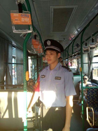 施梦澎的工作是站在公交车上观察各色人等,发现可疑人员就查包。从今年6月底至今,施梦澎和他的同事们已经连续工作了60多天。成为“网红”后,施梦澎还时常要接待公交车站台上要求合影的“迷妹”。