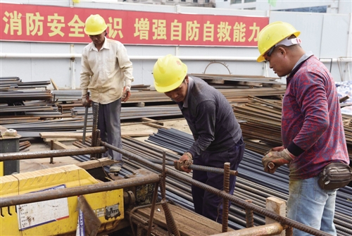 9月15日,中铁十八局集团四公司的3名工人在昆明塘子巷车站工地工作。当日,全国各地依然有许多劳动者坚守岗位,在工作中迎来中秋佳节。新华社记者 杨宗友 摄