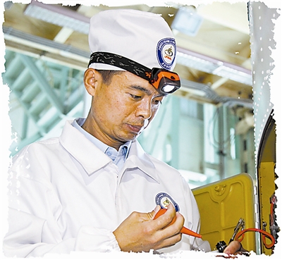 初秋的戈壁,仍保持着34度高温。载人航天发射场发射塔架的二级箱间段内,主操作手季明刚稳稳地将40余斤重的控制系统电池,送入即将搭载“天宫二号”空间实验室的长二F火箭箭体内部的电池支架上。